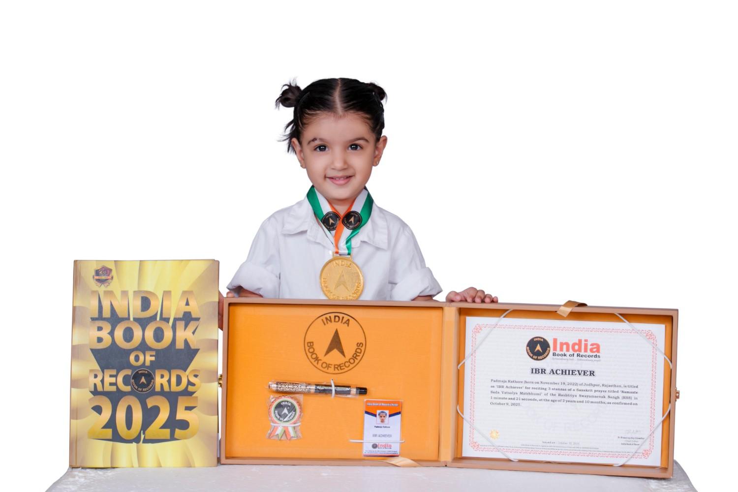 सुमेरपुर(पाली)- छोटी उम्र, बड़ा कारनामा — यही कहावत सुमेरपुर की नन्ही प्रतिभा पद्मजा राठौड़ पर सटीक बैठती है। महज 2 वर्ष 10 माह की आयु में पद्मजा ने अपनी विलक्षण स्मरण शक्ति और संस्कृत के प्रति लगाव से राष्ट्रीय स्तर पर नया इतिहास रच दिया है। इंडिया बुक ऑफ रिकॉर्ड्स ने पद्मजा को उनकी अद्भुत क्षमता के लिए “आईबीआर अवार्ड” से सम्मानित किया है। उन्होंने राष्ट्रीय स्वयंसेवक संघ (आरएसएस) की संस्कृत प्रार्थना “नमस्ते सदा वात्सले मातृभूमे” को सिर्फ 1 मिनट 21 सेकंड में कंठस्थ सुनाकर यह उपलब्धि हासिल की। यह रिकॉर्ड 9 अक्टूबर 2025 को इंडिया बुक ऑफ रिकॉर्ड्स की टीम द्वारा आधिकारिक रूप से प्रमाणित किया गया। संस्था ने पद्मजा की संस्कृत भाषा में स्पष्ट उच्चारण और सटीक प्रस्तुति की खुलकर सराहना की है। पद्मजा, जितेन्द्र सिंह गिलाकोर (आरपीएस) की सुपुत्री हैं। परिवार और पूरे क्षेत्र में इस उपलब्धि से खुशी की लहर है। उनके दादा कान सिंह (सरपंच, गिलाकोर) तथा नाना जसवंत सिंह इंदा (निंबो का गांव) ने गर्व व्यक्त करते हुए कहा कि पद्मजा ने न केवल परिवार, बल्कि पूरे क्षेत्र का नाम रोशन किया है। शहरवासियों और रिश्तेदारों ने भी पद्मजा की इस सफलता पर हर्ष व्यक्त करते हुए उज्जवल भविष्य की शुभकामनाएं दीं। संस्कृत भाषा के प्रति नन्ही पद्मजा का यह लगाव और असाधारण स्मरण शक्ति आने वाली पीढ़ी के लिए प्रेरणास्रोत है।