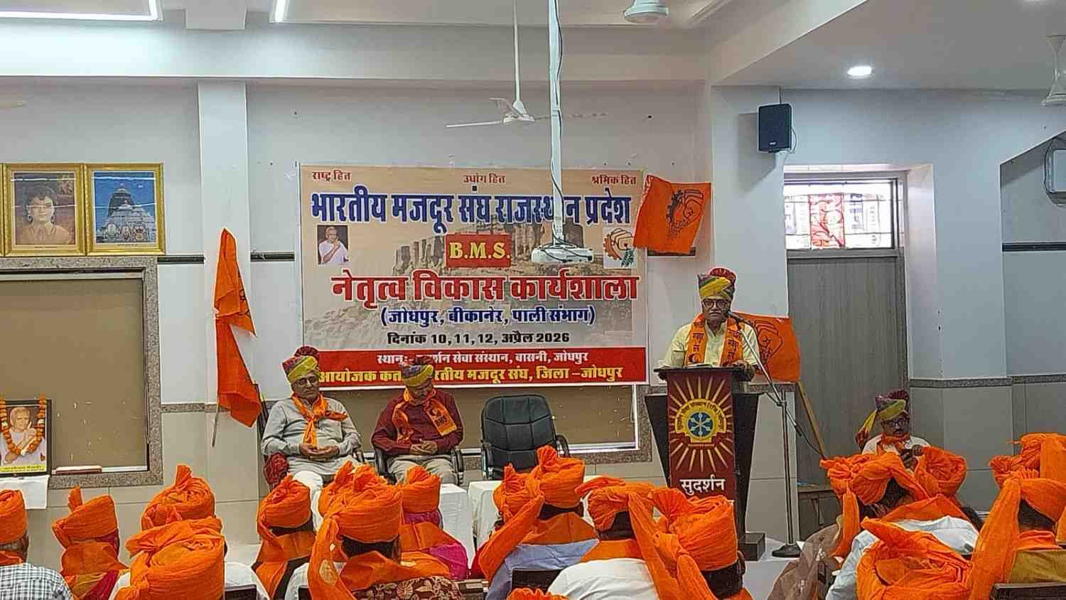 सुमेरपुर भारत के सबसे बड़े श्रम संगठन भारतीय मजदूर संघ, राजस्थान प्रदेश द्वारा संभाग स्तरीय तीन दिवसीय नेतृत्व विकास कार्यशाला का शुभारम्भ जोधपुर के बासनी क्षेत्र स्थित सुदर्शन सेवा संस्थान में हुआ। ‘राष्ट्र हित – उद्योग हित – श्रमिक हित’ के ध्येय वाक्य के साथ आयोजित इस कार्यशाला का उद्देश्य कार्यकर्ताओं में नेतृत्व क्षमता का विकास कर संगठन को जमीनी स्तर तक सशक्त बनाना है। ताकि नेतृत्व विकास से कार्यकर्ता का उत्थान हो सके l कार्यक्रम का शुभारम्भ भारतीय मजदूर संघ के प्रदेश अध्यक्ष राजेंद्र सिंह डाबी एवं प्रदेश महामंत्री हरिमोहन शर्मा द्वारा दंतोपंथ ठेंगड़ी विश्वकर्मा भगवान तथा भारत माता के चित्र पर दीप प्रज्वलित में तथा माल्यार्पण के साथ हुआ। कार्यक्रम की अध्यक्षता जोधपुर जिला अध्यक्ष भंवर सिंह आंगनवा ने की। इस अवसर पर प्रदेश उपाध्यक्ष नारायण सिंह राजपुरोहित, कुशला राम गौरी शंकर व्यास प्रदेश मंत्री मोहनलाल माली आशा यूनियन की प्रदेश मंत्री कंचन मालवीय नीतू माली तथा प्रदेश पदाधिकारी ब्रजेश शर्मा सहित अनेक पदाधिकारी उपस्थित रहे।कार्यशाला में पश्चिमी राजस्थान के तीन प्रमुख संभाग—जोधपुर, बीकानेर एवं पाली—से सैकड़ों युवा कार्यकर्ता एवं पदाधिकारी भाग ले रहे हैं। 10 अप्रैल से 12 अप्रैल तक आयोजित इस प्रशिक्षण शिविर में संगठन विस्तार, श्रमिक हित, नेतृत्व क्षमता विकास तथा कार्यकर्ताओं की कार्यशैली को सुदृढ़ बनाने पर विशेष जोर दिया जा रहा है।