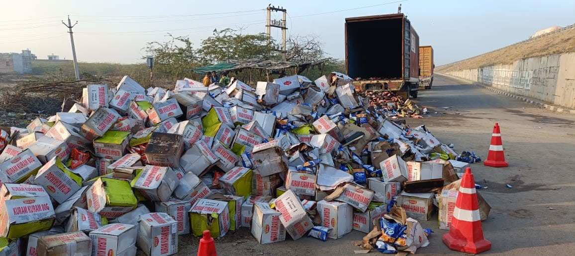 साण्डेराव फोरलेन हाइवे बाईपास के पास अचानक शार्ट सर्किट से कूरकूरे से भरा कंटेनर जला